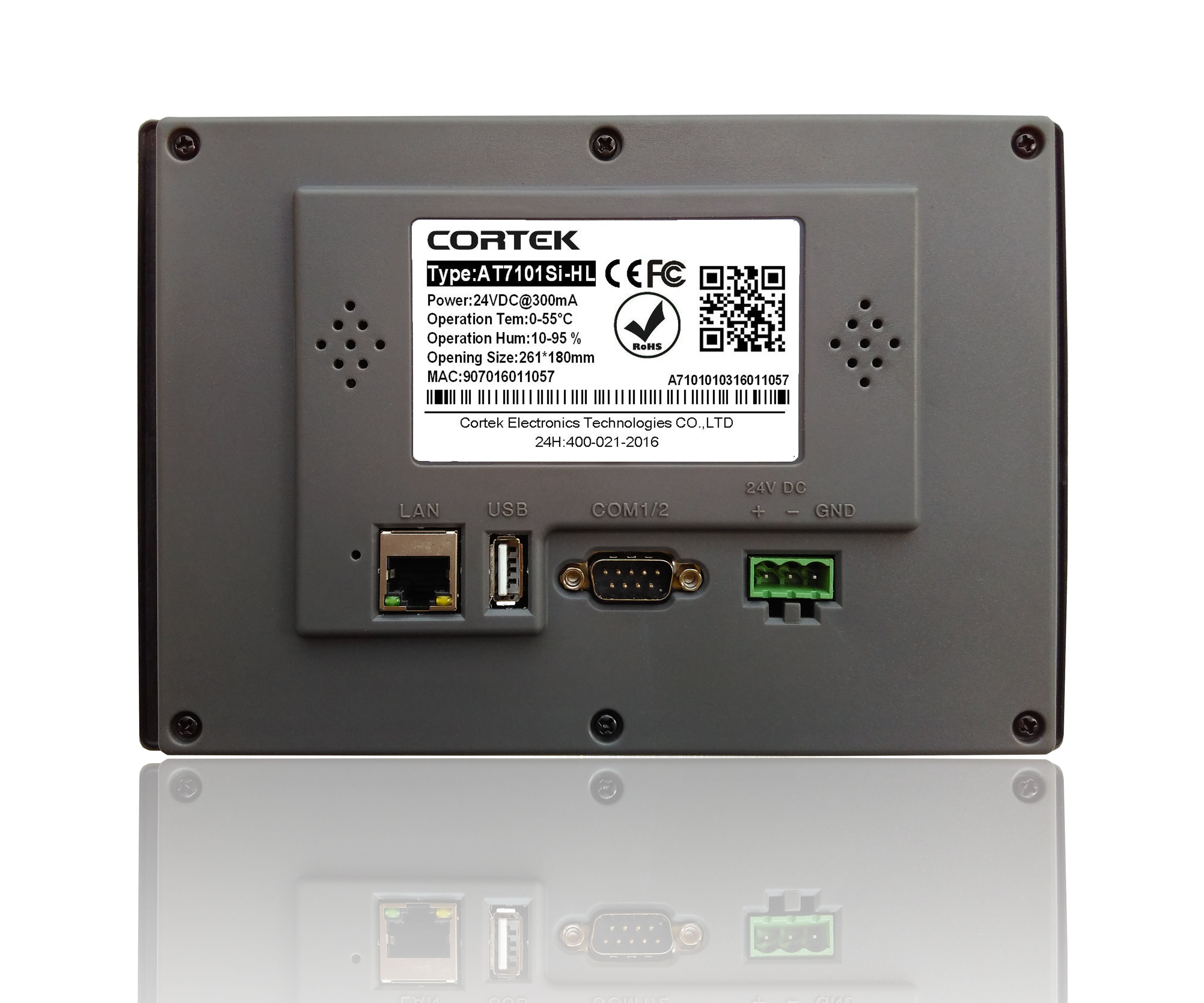 英寸高亮LED液晶顯示器(分辨率1024*600),四線電阻式觸摸屏(辨率4096*4096)。支持WIN CE6.0, 同時預(yù)裝CORWARE V2.9.8工業(yè)組態(tài)軟件。